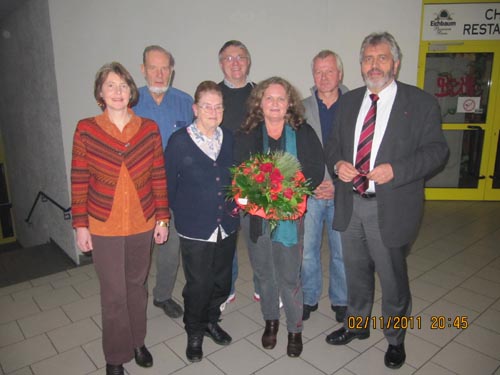 Ihr Nachfolger im Amt, der bisherige Vize Ulf Dreßler, überreichte Beate Adler einen großen Blumenstrauß, natürlich ganz in Rot gehalten. Neuer Stellvertreter des Vorsitzenden wurde German Braun. Für den scheidenden Kassier Dr. Wolfgang Möller fand dessen Nachfolger Fredy Busse lobende Worte. „Du hast in den vergangenen elf Jahren das Geld zusammengehalten, ohne auf der Kasse zu sitzen“, so Busse. Damit habe er die Rücklagen für die bevorstehenden Wahlkämpfe und die Jubiläumsfeierlichkeiten im Jahr 2014 geschaffen. Außerdem sei er ein ständiger Mahner für Beitragsehrlichkeit gewesen. Zum Dank für seine hervorragende Arbeit überreichte Busse ihm eine edle Flasche Wein. Schriftführer bleibt Hans Hackenthal, Sylvia Büttner ist weiterhin für die Presse zuständig. Beate Adler und Wolfgang Möller bleiben dem Vorstand als Beisitzer erhalten, ebenso Maria Gumb, Bodo Nakoinz und Hiltrud Sanchez.